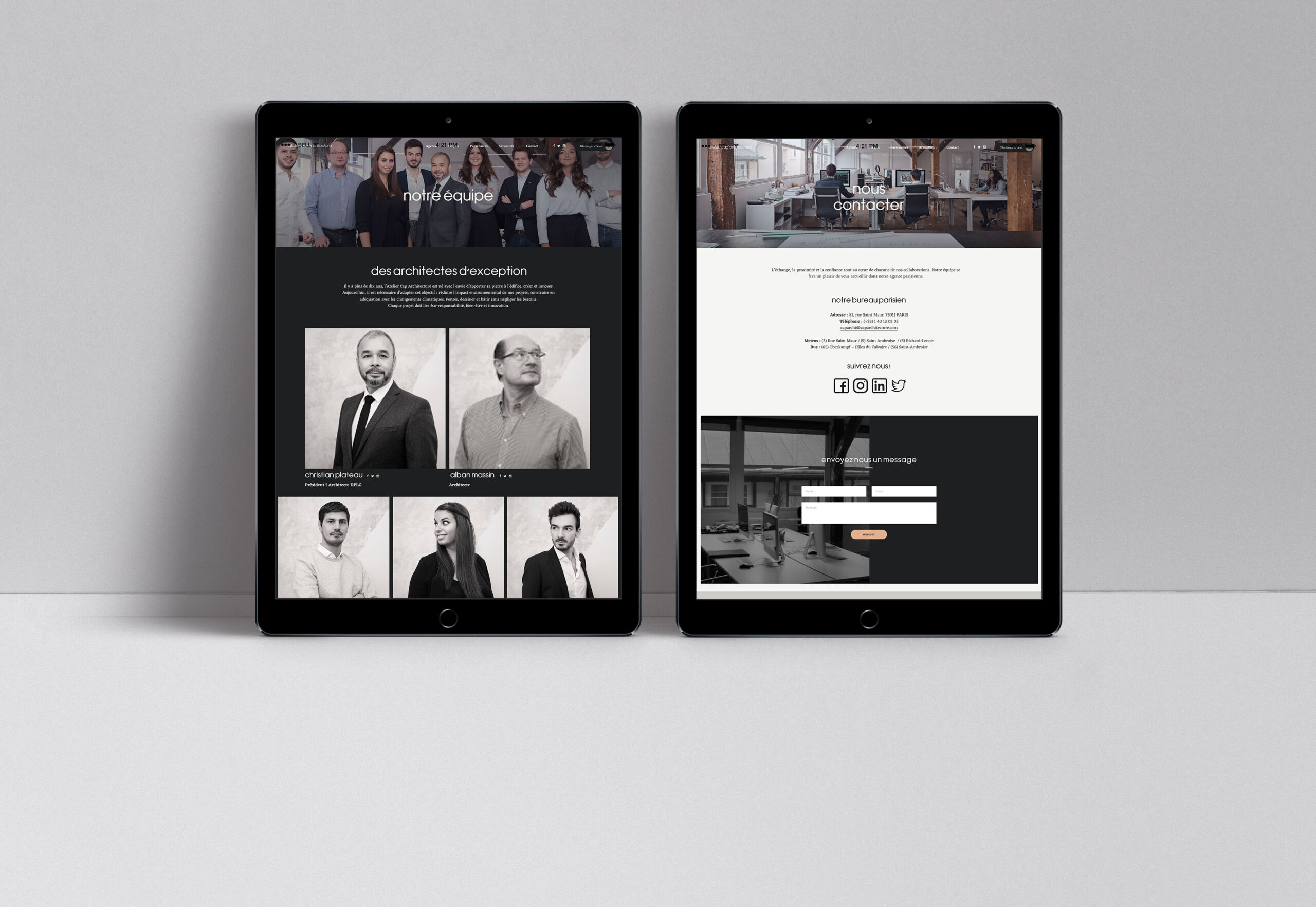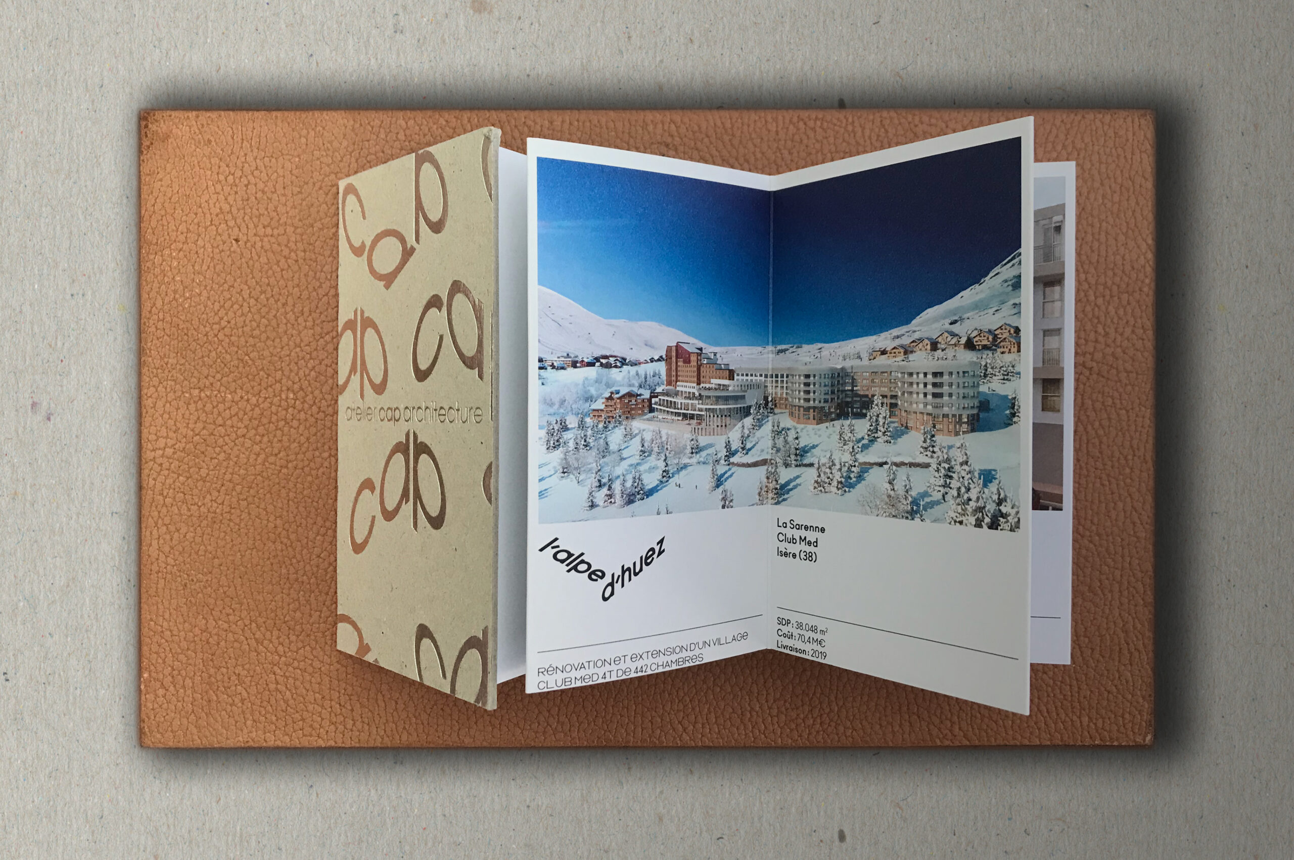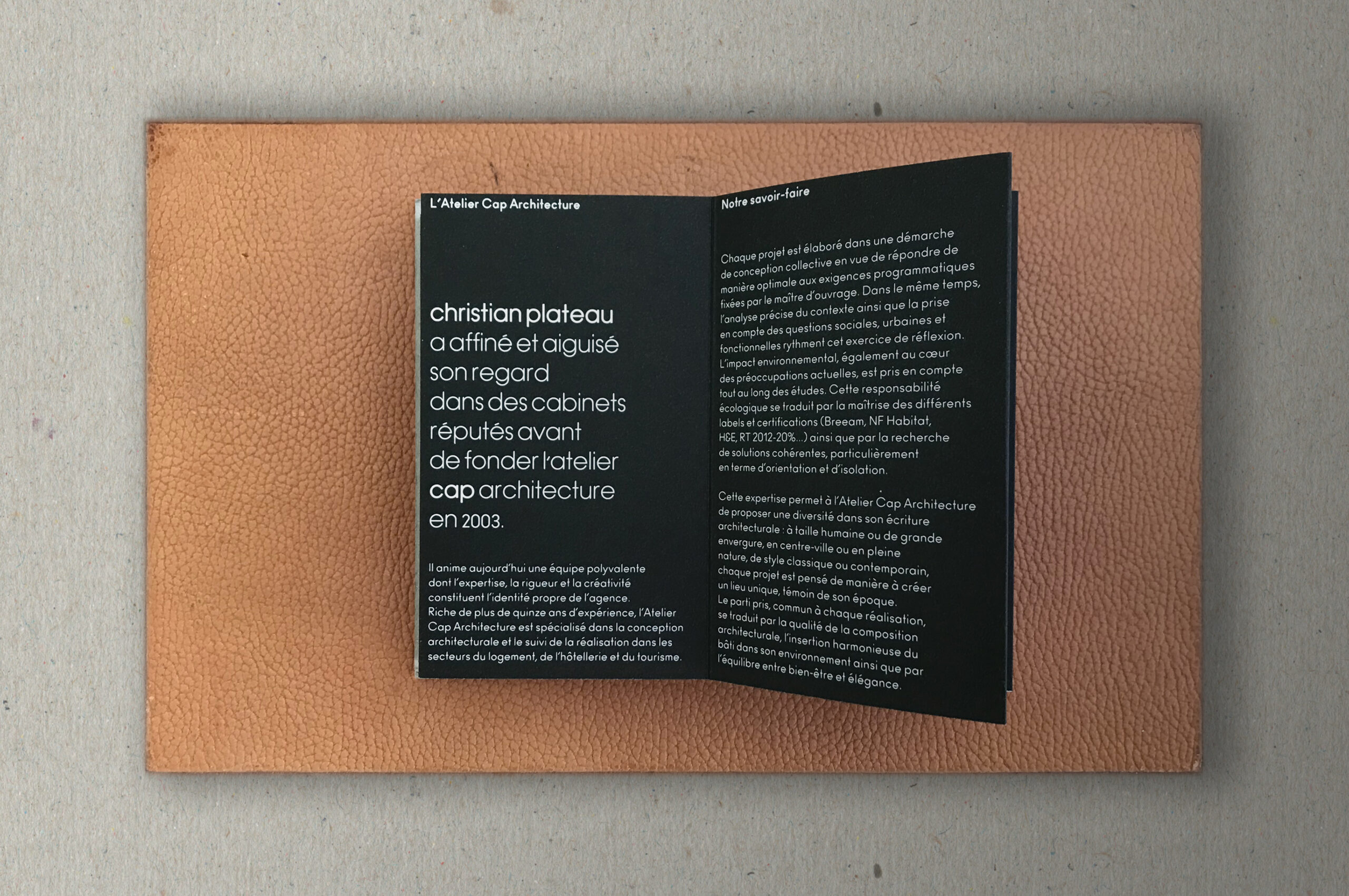 We collaborated with CAP Architecture, a Parisian agency committed to sustainable building practices, to create a brand identity that blends traditional craftsmanship and modern design. The catalogue, produced through letterpress and hot foil stamping, was designed to be a beautiful, collectible object that reflects the agency’s values. Additionally, we designed a user-friendly website that highlights their innovative approach to eco-conscious architecture. This project captures the essence of sustainable design through every detail, from print to digital experience.